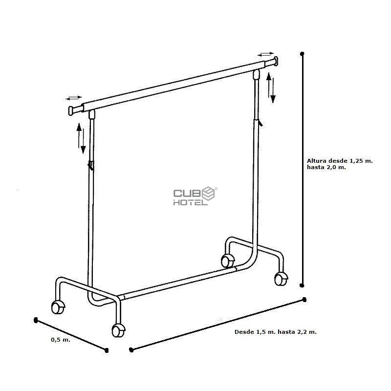 Dimensiones: Longitud ajustable de 1,5 ma 2,2 m, altura ajustable de 1,25 ma 1,9 m.