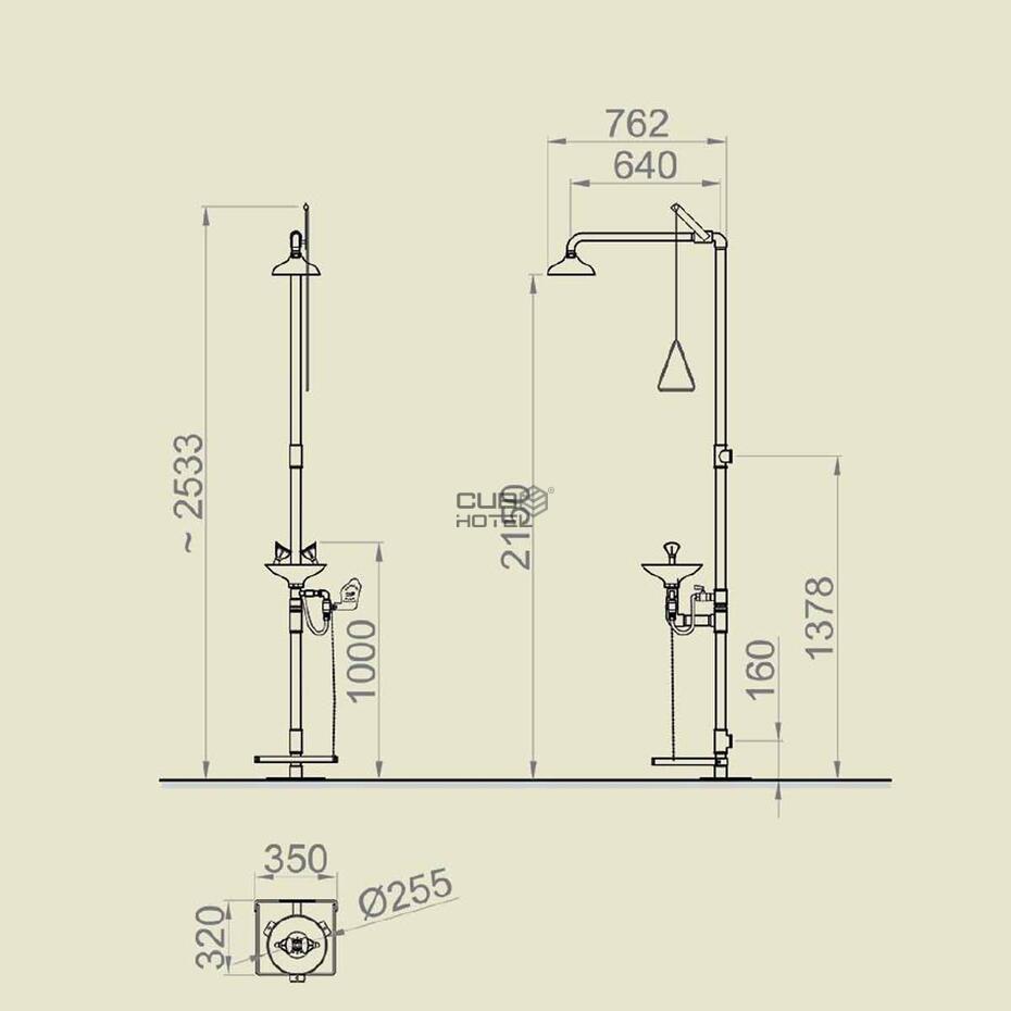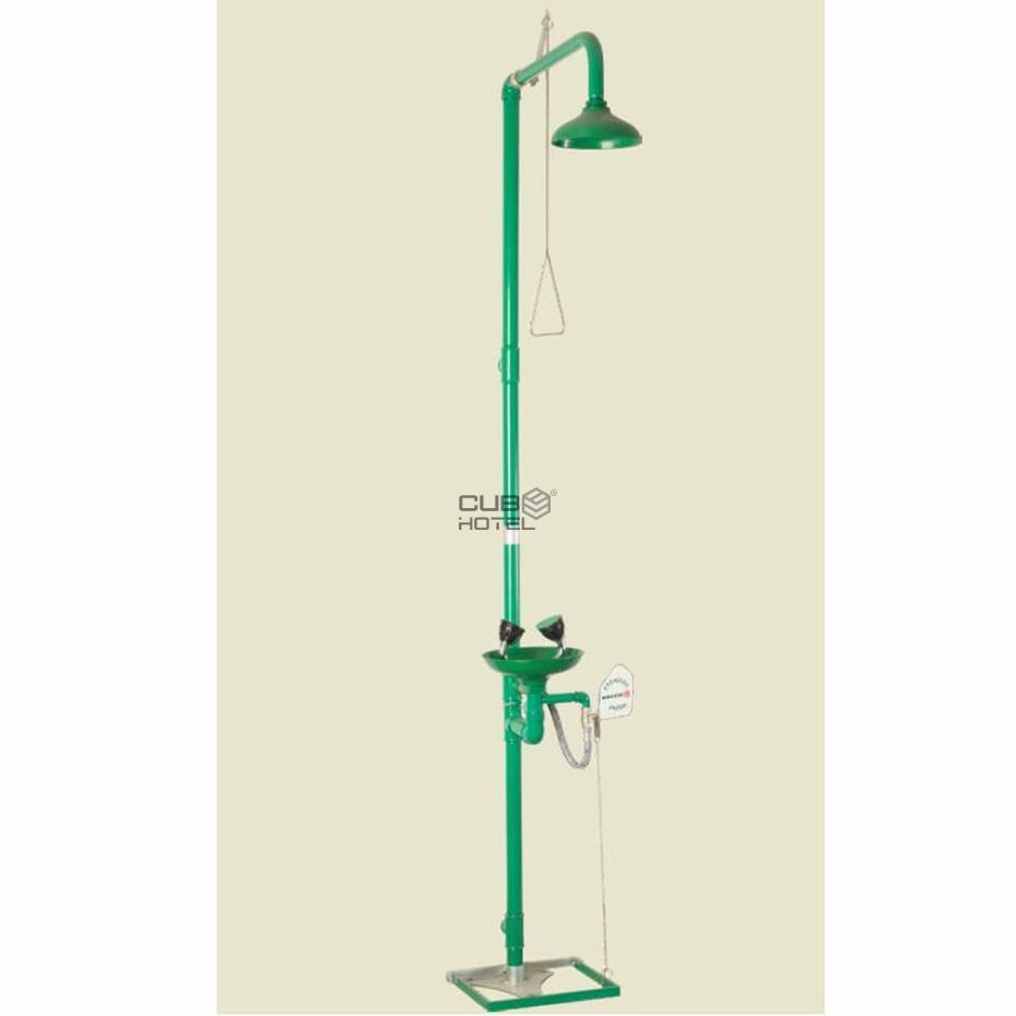 - Ducha y lava-ojos de emergencia con triple mando de accionamiento