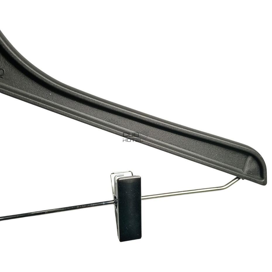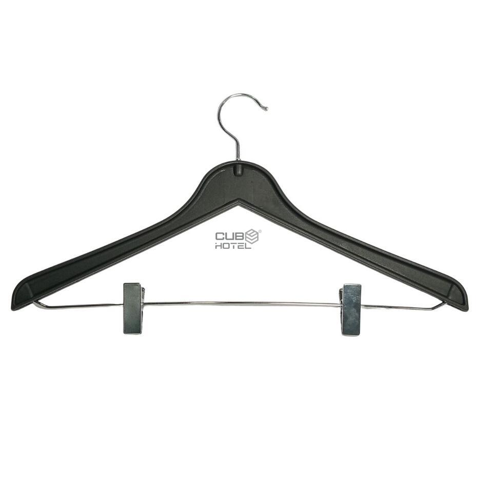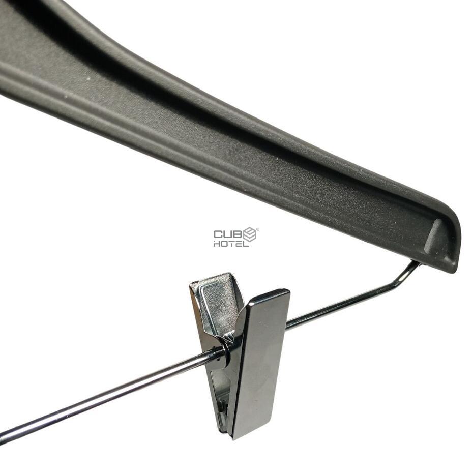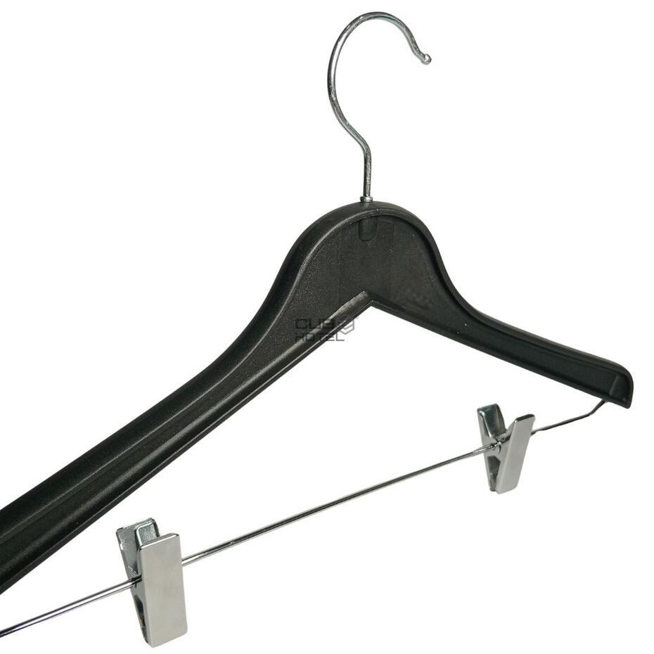 Conjunto de 100 perchas de plástico negro con pinzas, ideales para colgar pantalones, faldas, toallas o prendas delicadas.