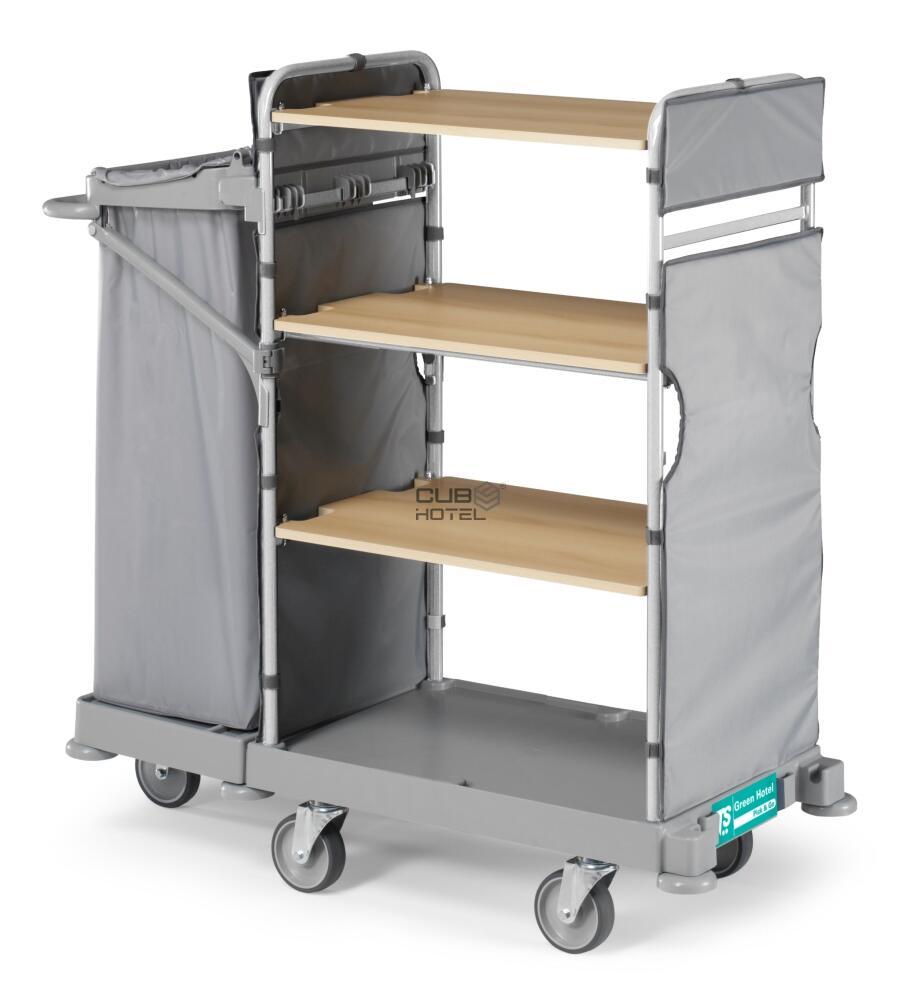 • Equipado con - 1 porta saco plastificado 120L para la recogida de ropa sucia y repisas.