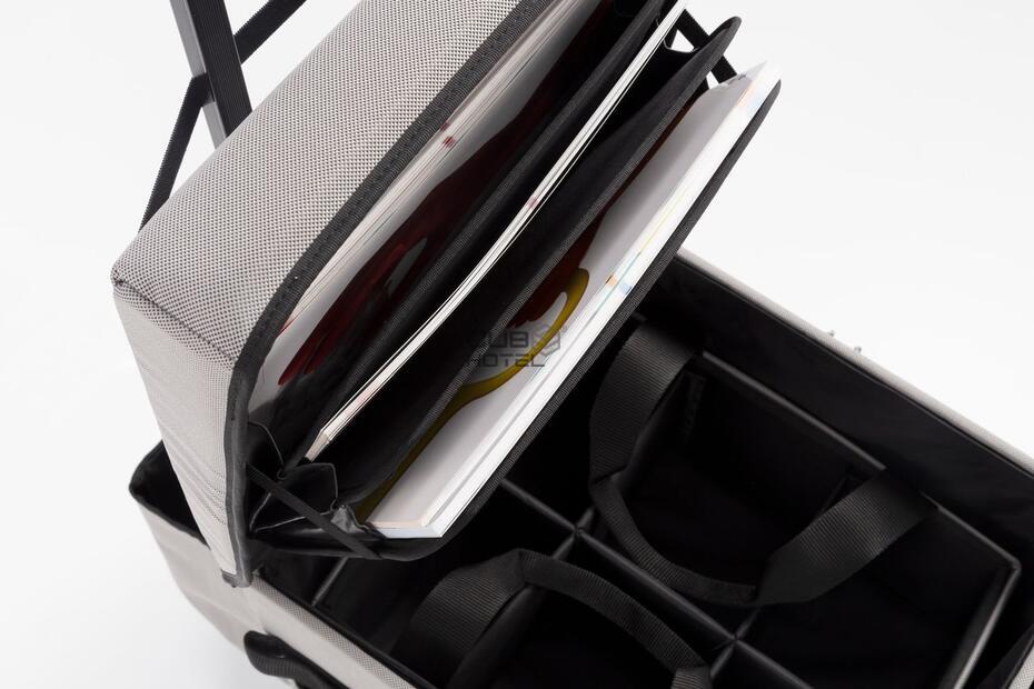 Completo de bandeja extraíble, bolsillos multiuso, gancho y banda con sistema adherente para fijar herramientas y separadores móviles.