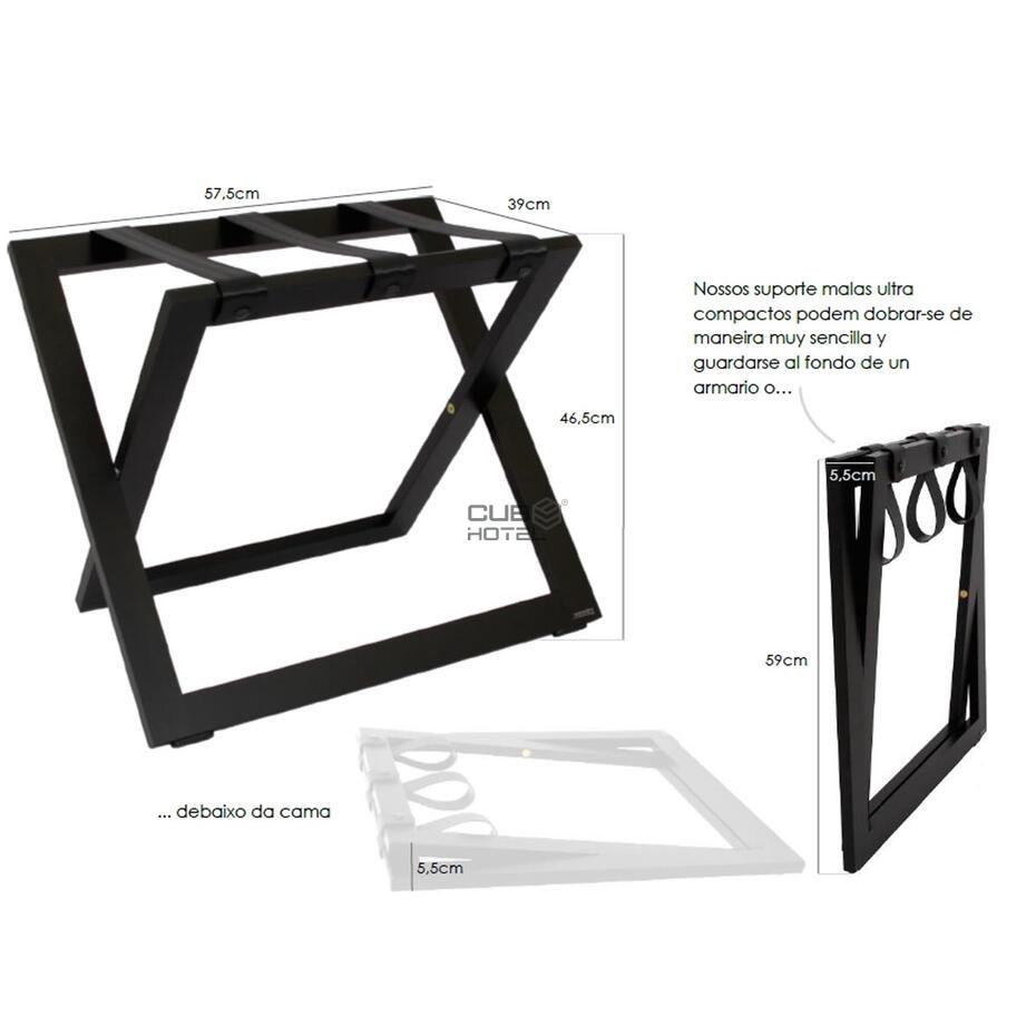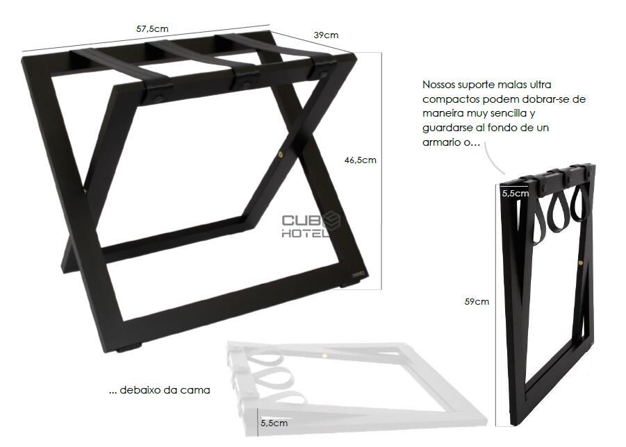 - Proteja sus camas y sábanas del polvo del camino y evite que sus huéspedes ocupen un espacio preciado en sus camas o escritorios para hacer o deshacer la maleta con nuestro elegante portaequipajes de diseño holandés. Estos soportes para equipaje ultra compactos son fáciles de usar para sus huéspedes y proporciona un acceso fácil al equipaje. Pueden doblarse de manera muy sencilla y guardarse al fondo de un armario o debajo de la cama. Además, los maleteros están equipados con 3 bandas intercambiables muy resistentes para que puedan sujetar todo tipo de bolsas y maletas (pesadas).