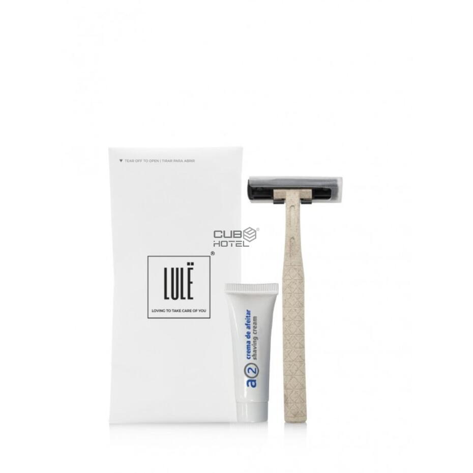 - O set de barbear inclui 1 lâmina descartável em material PSM biodegradável e 1 tubo de creme de barbear A2 (10g), acondicionado em embalagem abre-fácil de papel pedra FSC®, uma alternativa ecológica ao plástico.