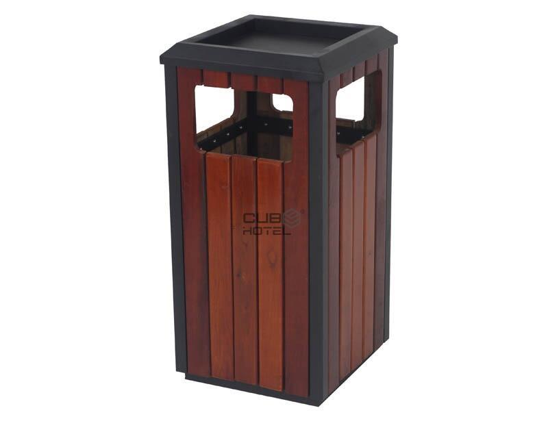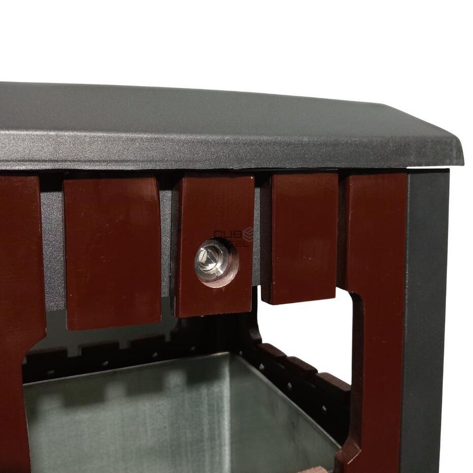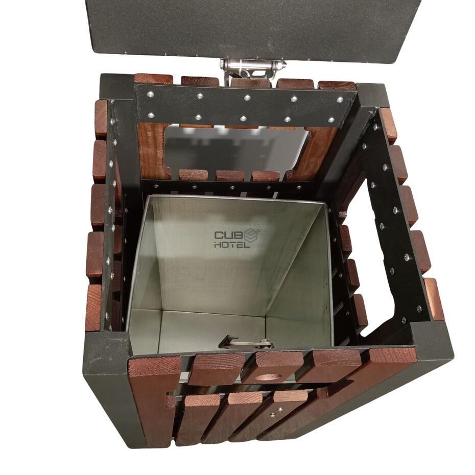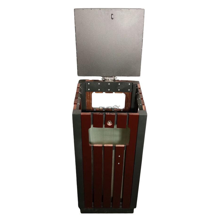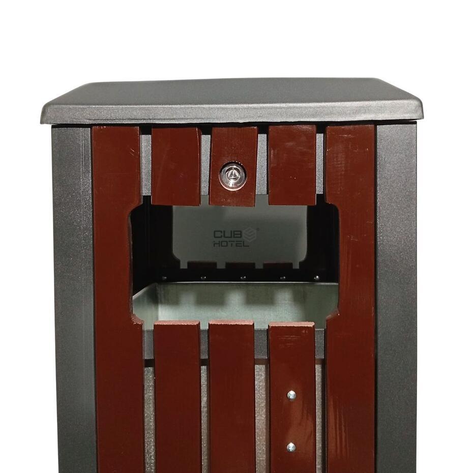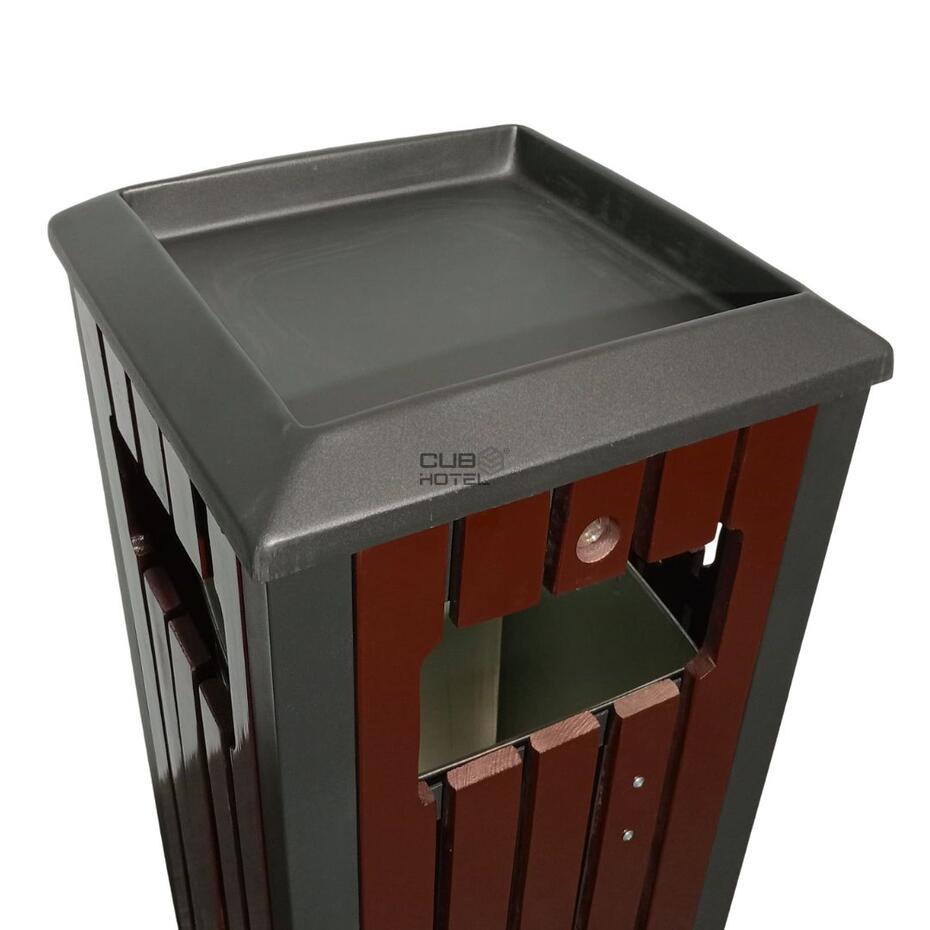 - A parte superior inclui um cinzeiro metálico integrado, enquanto o interior possui um balde removível em aço galvanizado, com capacidade de 25 litros.