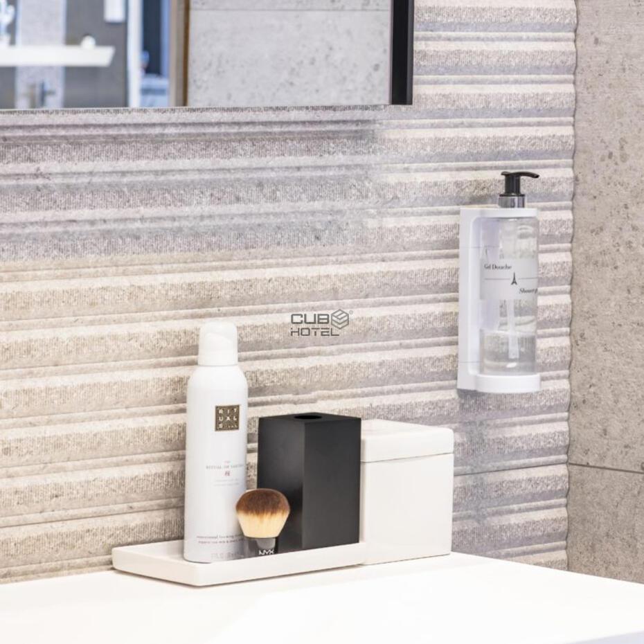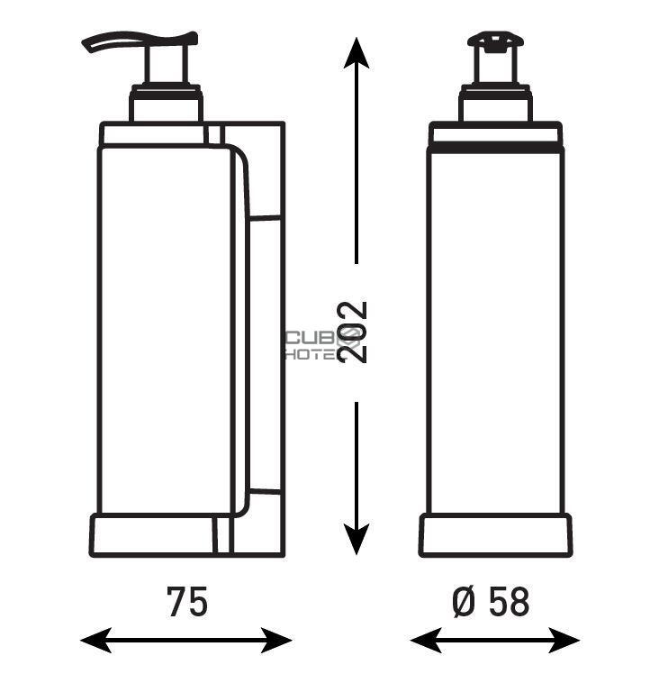 O modelo apresenta um indicador de nível prático e inclui três etiquetas para identificar facilmente sabonete, champô ou loção, facilitando a organização nos espaços comuns do hotel.