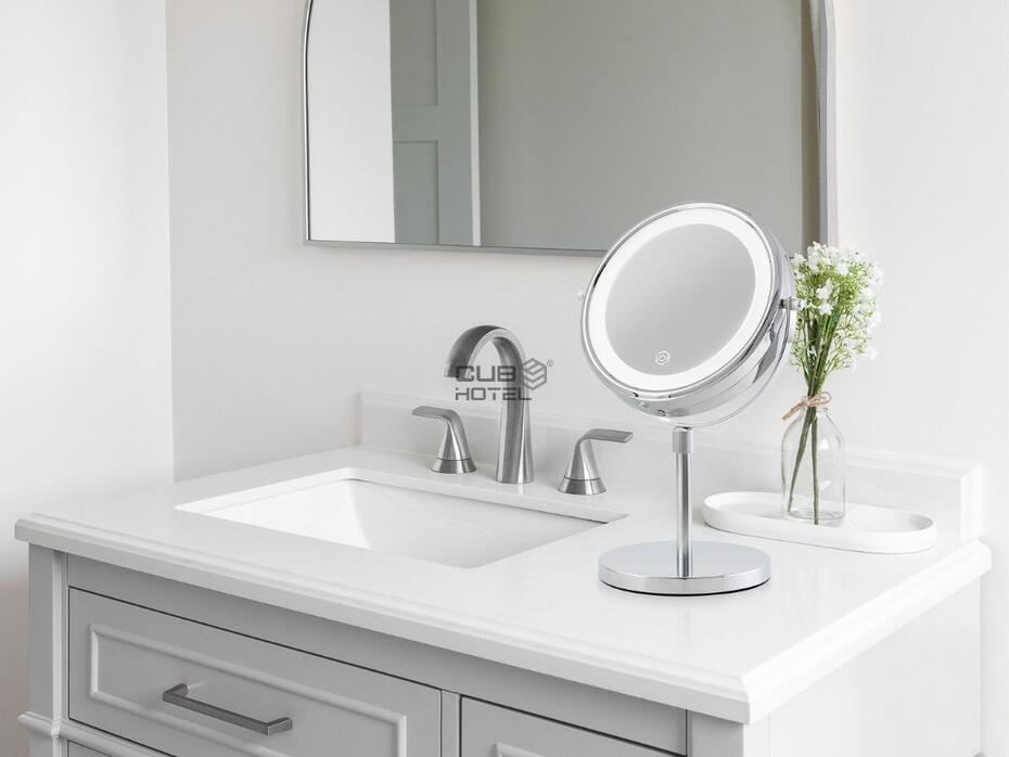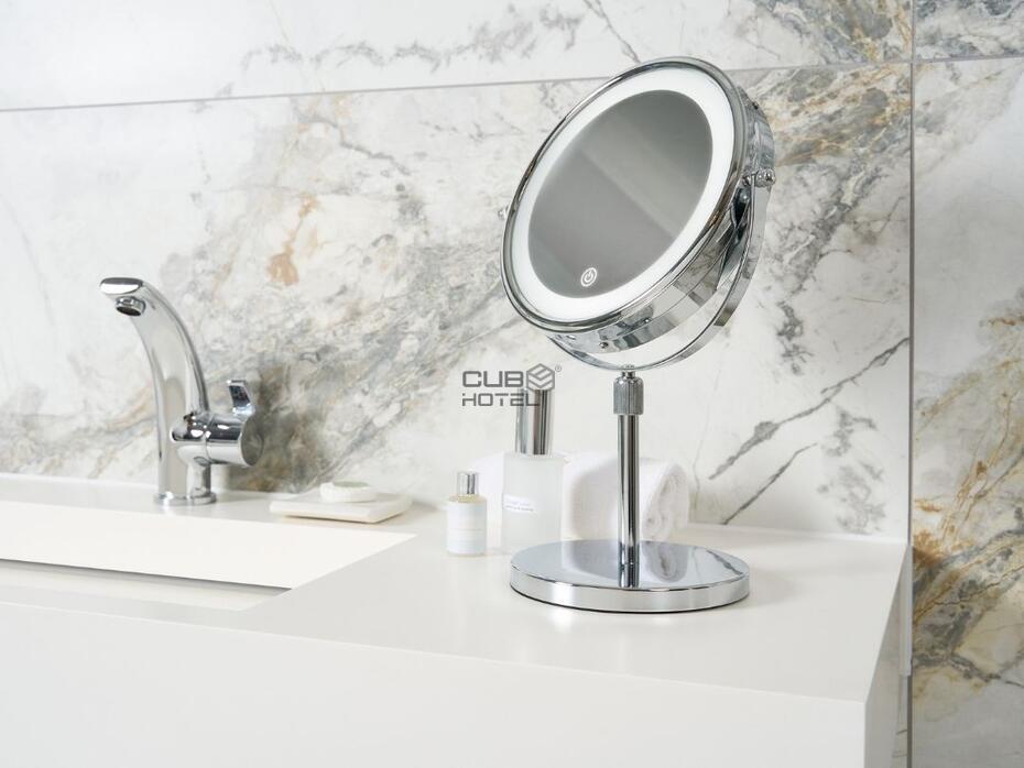 O Espelho Winchester LED de mesa cromado melhora a experiência dos hóspedes, oferecendo iluminação precisa e design sofisticado para cuidados pessoais.