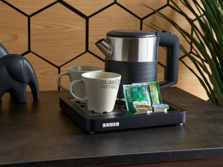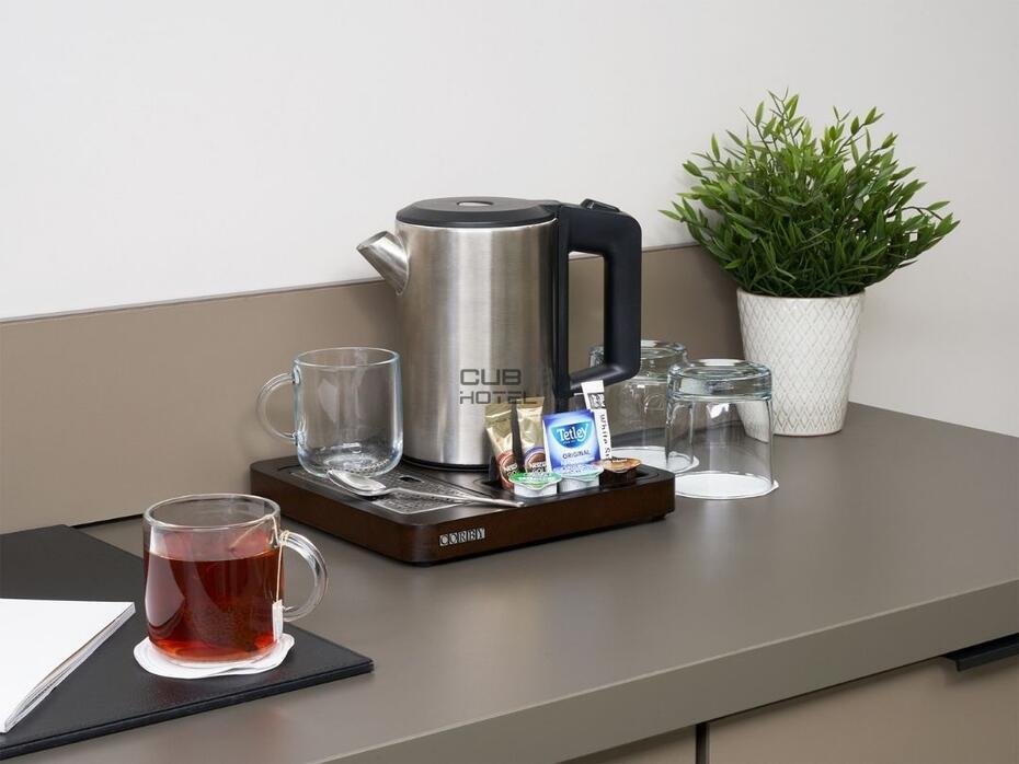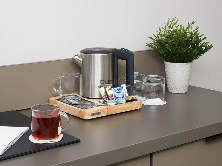 O tabuleiro de boas-vindas Canterbury Compact é a solução prática e elegante para preparar bebidas quentes em quartos de hotel.